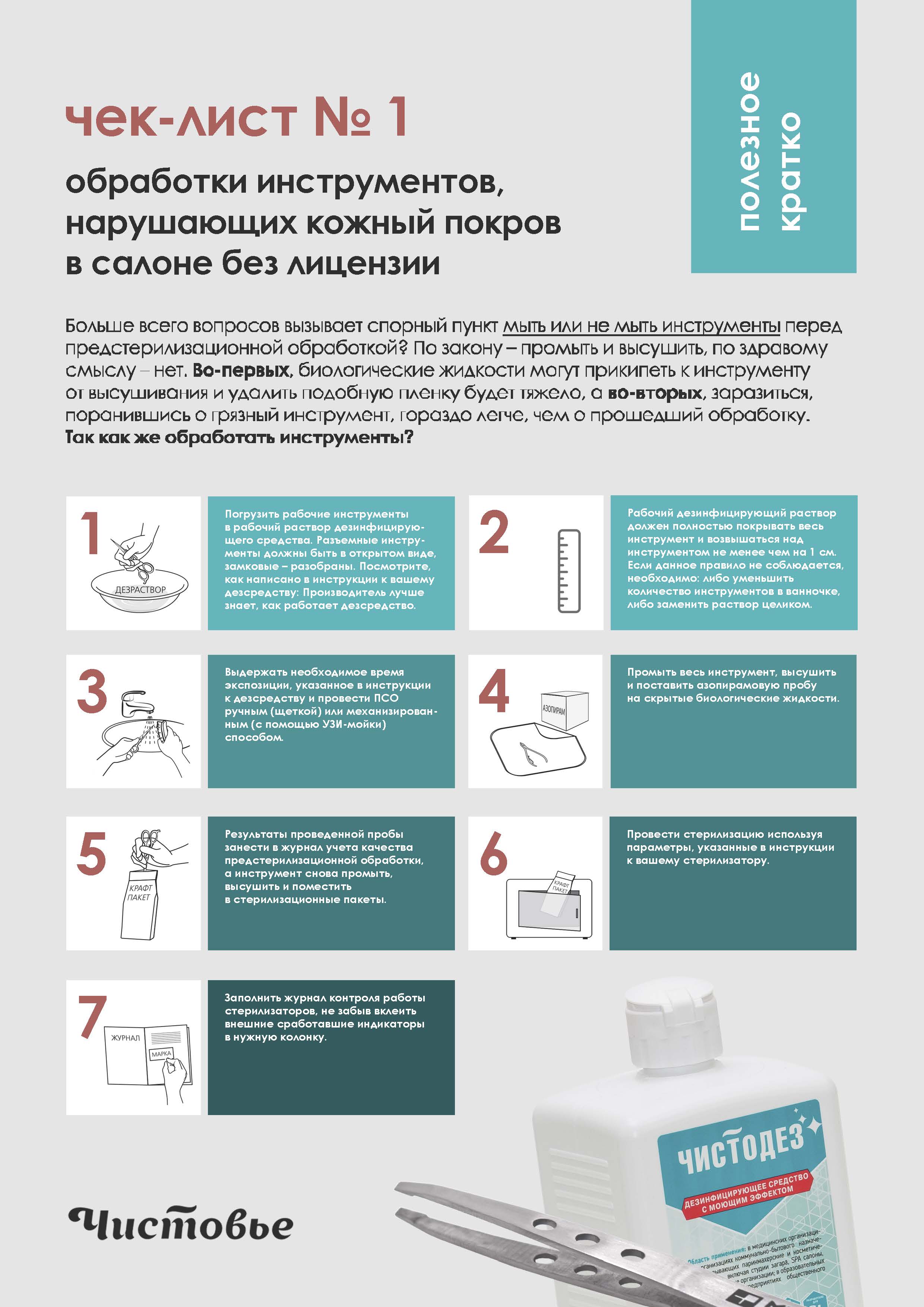 Дезинфицирующие средства. Обязательно концентрат – подходит для дезинфекции поверхностей, уборки, стирки, дезинфекции инструментов. Спрей для экстренной дезинфекции или салфетки подойдут, чтобы протереть поверхность, осветительное оборудование, но ни для каких других манипуляций (в т.ч. для дезинфекции инструмента) не подходят.