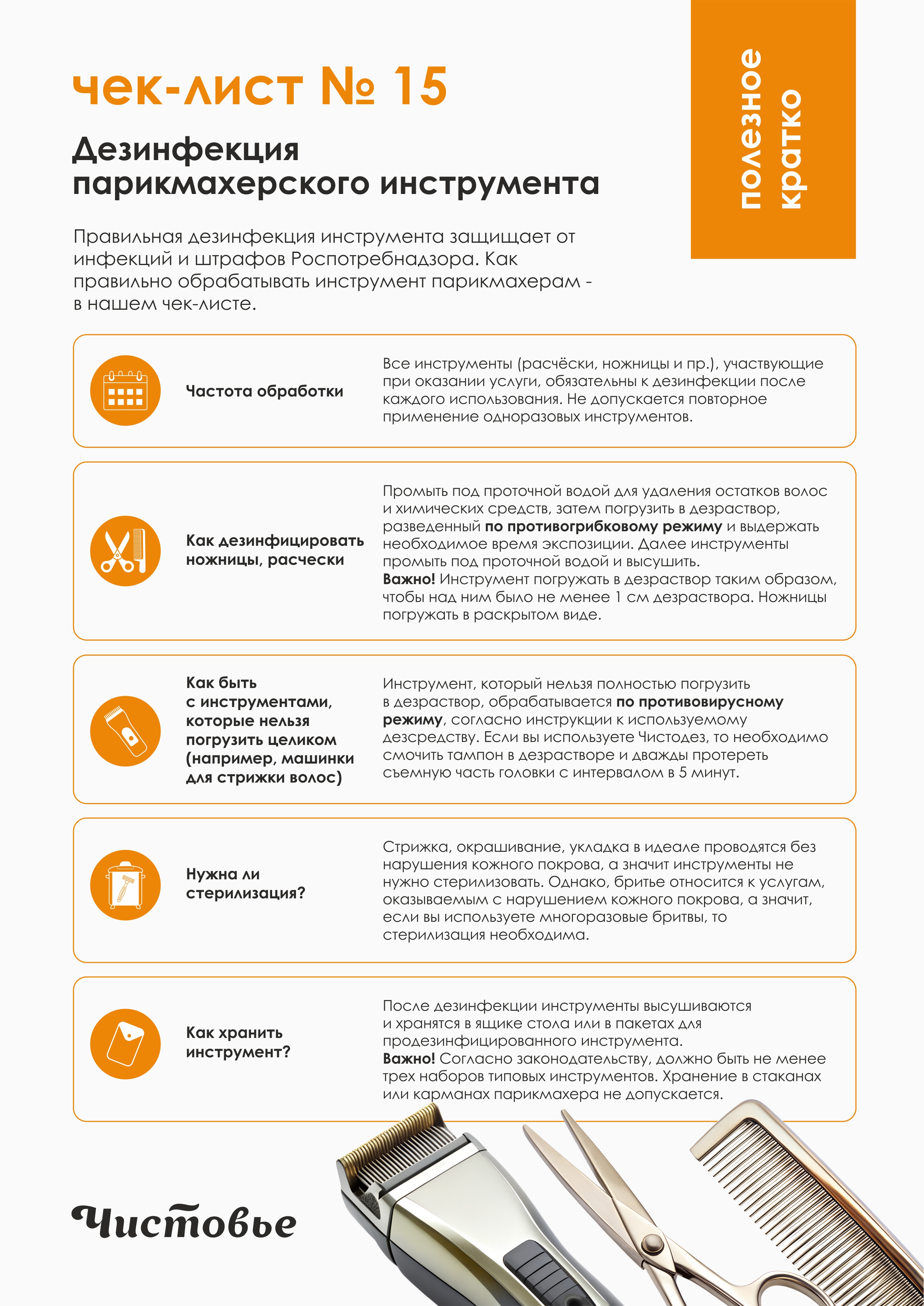 Ножницы и расчески. Профессиональные ножницы и расчески профессиональных серий — залог безупречной работы мастера. Помните, что инструменты необходимо дезинфицировать после каждого клиента методом полного погружения, а значит металл и пластик из которого изготовлены инструменты должны быть качественными, чтобы прослужить вам достаточно долго.