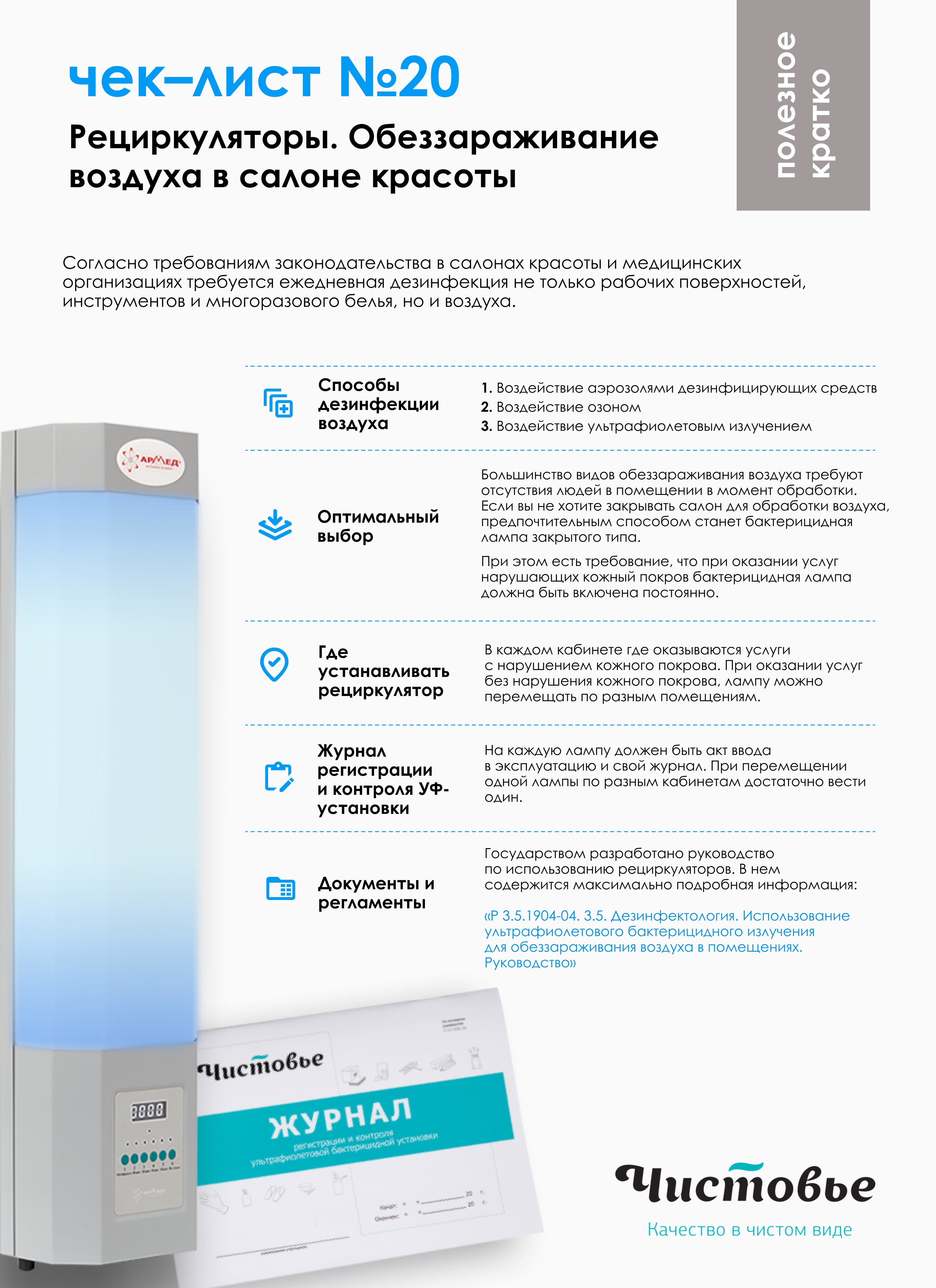 Дезинфекция воздуха является обязательным, а не рекомендованным мероприятием. Для обработки воздуха используют специальные баклампы (рециркуляторы). Учитывая, что услуги оказываются при нарушении кожного покрова, крайне важно, чтобы рециркулятор функционировал на протяжении всей процедуры. Это подразумевает, что устройство должно быть закрытого типа, что позволит его использование без дополнительных средств специальной защиты.
