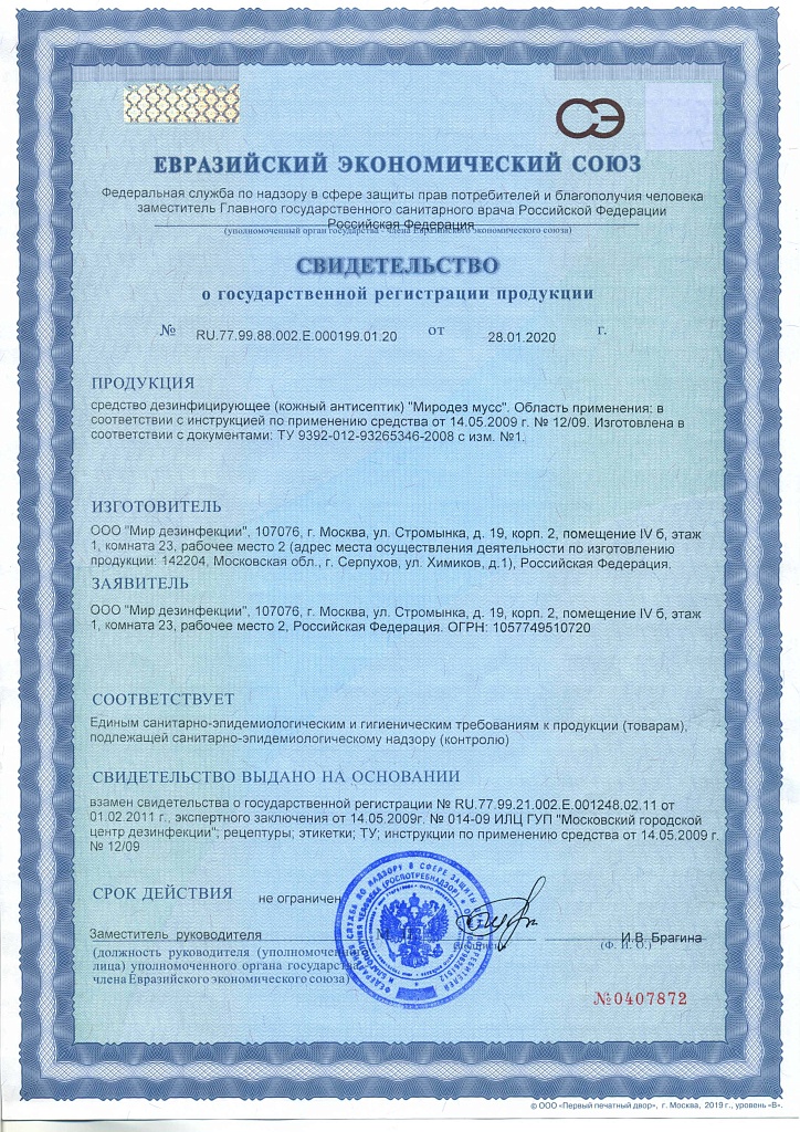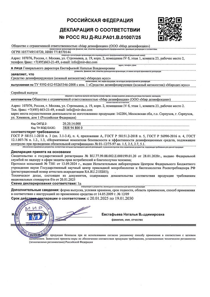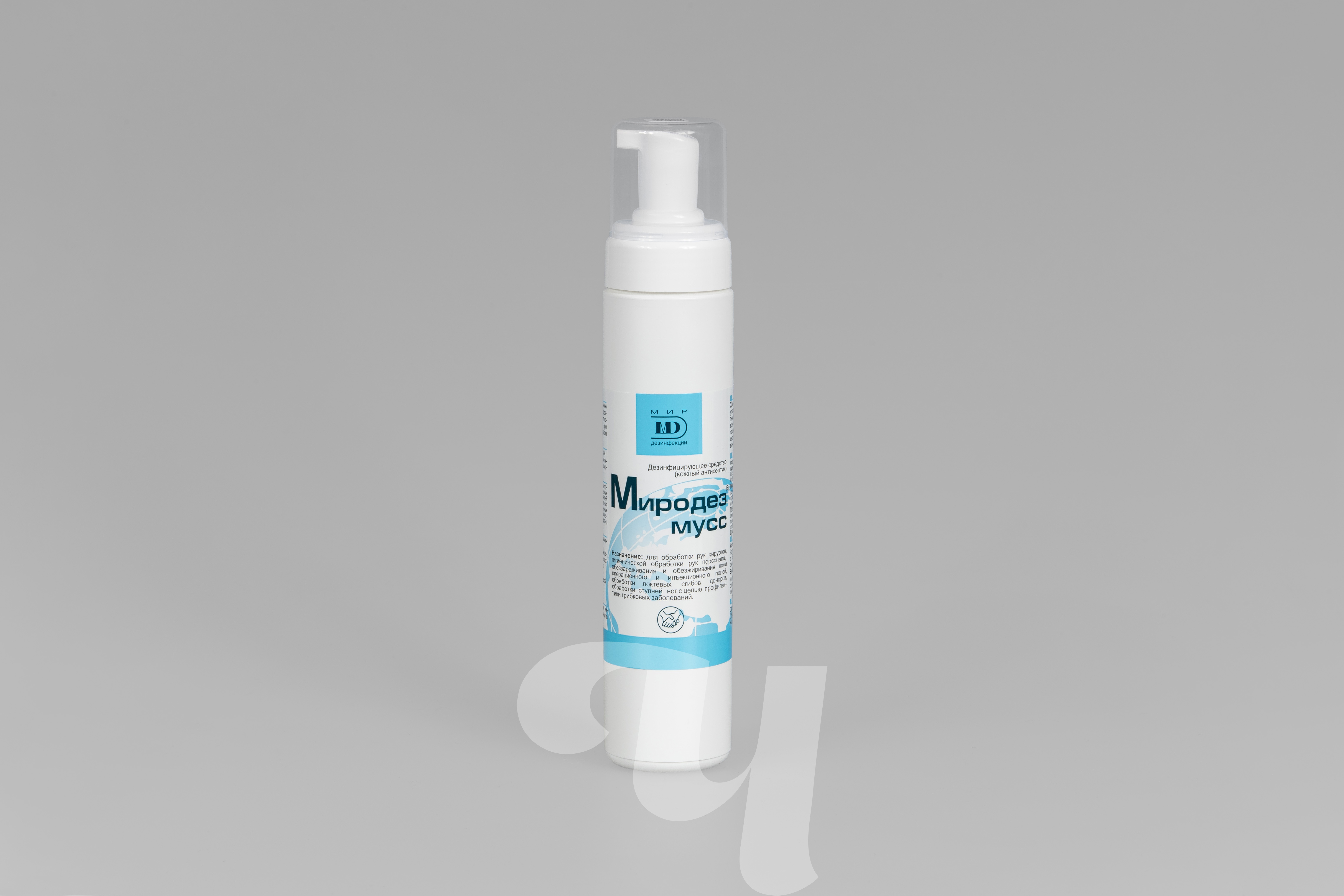 Бесспиртовой кожный антисептик. Применяется в виде пены и в жидком виде для обработки рук, кожи инъекционного поля, ступней.  Средство обладает антимикробной активностью в отношении грамотрицательных и грамположительных бактерий (включая микобактерии туберкулеза), вирусов (включая вирусы полиомиелита,парентаральных гепатитов, ВИЧ), патогенных грибов рода Кандида и Трихофитон. Пролонгированное антимикробное действие не менее 5 часов. Подавляет образование "перчаточного сока". Средство содержит в составе увлажняющие кожу компоненты и не вызывает раздражения.  Бесспиртовой антисептик Миродез Мусс используется в соответствии с инструкцией по применению. Ознакомиться с инструкцией по применению антисептика Миродез Мусс можно на нашем сайте.
