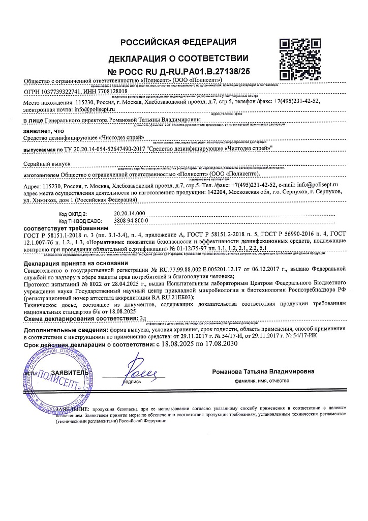 Готовое к применению бесспиртовое средство для экстренной дезинфекции последнего поколения. Совместная разработка компаний "Чистовье" и "Полисепт". Эффективные режимы с короткой экспозицией - 30 секунд. Средство подходит для разных поверхностей, не портит покрытия, не обесцвечивает ткани, не вызывает коррозии металлов. Без неприятного запаха. Предназначено для профилактической дезинфекции в организациях коммунально-бытового назначения, оказывающих парикмахерские и косметические услуги, гостиницах, общежитиях, санпропускниках, банях, саунах, прачечных, соляриях, бассейнах, спортивно-оздоровительных комплексов. В качестве действующих веществ содержит комплекс четвертичных аммониевых соединений (ЧАС) - 0,3%, полигексаметиленгуанидин гидрохлорид (ПГМГ) – 0,04%, а также вспомогательные компоненты (ПАВы, синергисты биоцидов, ингибитор коррозии и пр.); рН средства - 7,0. Средство несовместимо с мылами и анионными поверхностно-активными веществами. Дезинфицирующее средство Чистодез Спрей используется в соответствии с инструкцией по применению. Ознакомиться с инструкцией по применению дезинфицирующего средства Чистодез Спрей можно на нашем сайте.