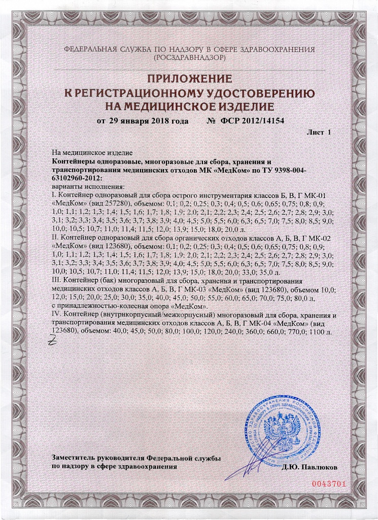 Контейнер одноразовый для сбора острых инструментов. Изготовлен из прочного пластика, устойчивого к прокалыванию. Основное предназначение — предутилизационное хранение и дезинфекция, а также утилизация медицинских отходов класса Б. Удобные отверстия обеспечивают безопасное снятие колющих и режущих элементов. Емкость для утилизации медицинских игл используется в процедурных, хирургических, физиотерапевтических и стоматологических кабинетах. Изготавливается в разных объемах: 6 л, 3 л, 1 л, 1,5 л и 0,5 л.