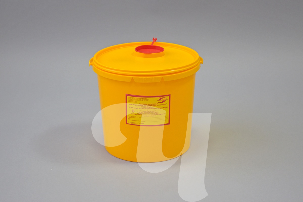 Контейнер одноразовый для сбора острых инструментов. Изготовлен из прочного пластика, устойчивого к прокалыванию. Основное предназначение — предутилизационное хранение и дезинфекция, а также утилизация медицинских отходов класса Б. Удобные отверстия обеспечивают безопасное снятие колющих и режущих элементов. Емкость для утилизации медицинских игл используется в процедурных, хирургических, физиотерапевтических и стоматологических кабинетах. Изготавливается в разных объемах: 6 л, 3 л, 1 л, 1,5 л и 0,5 л.