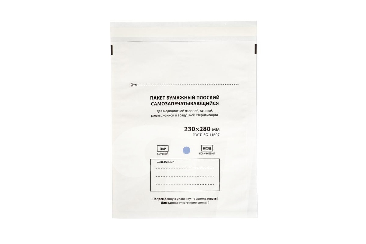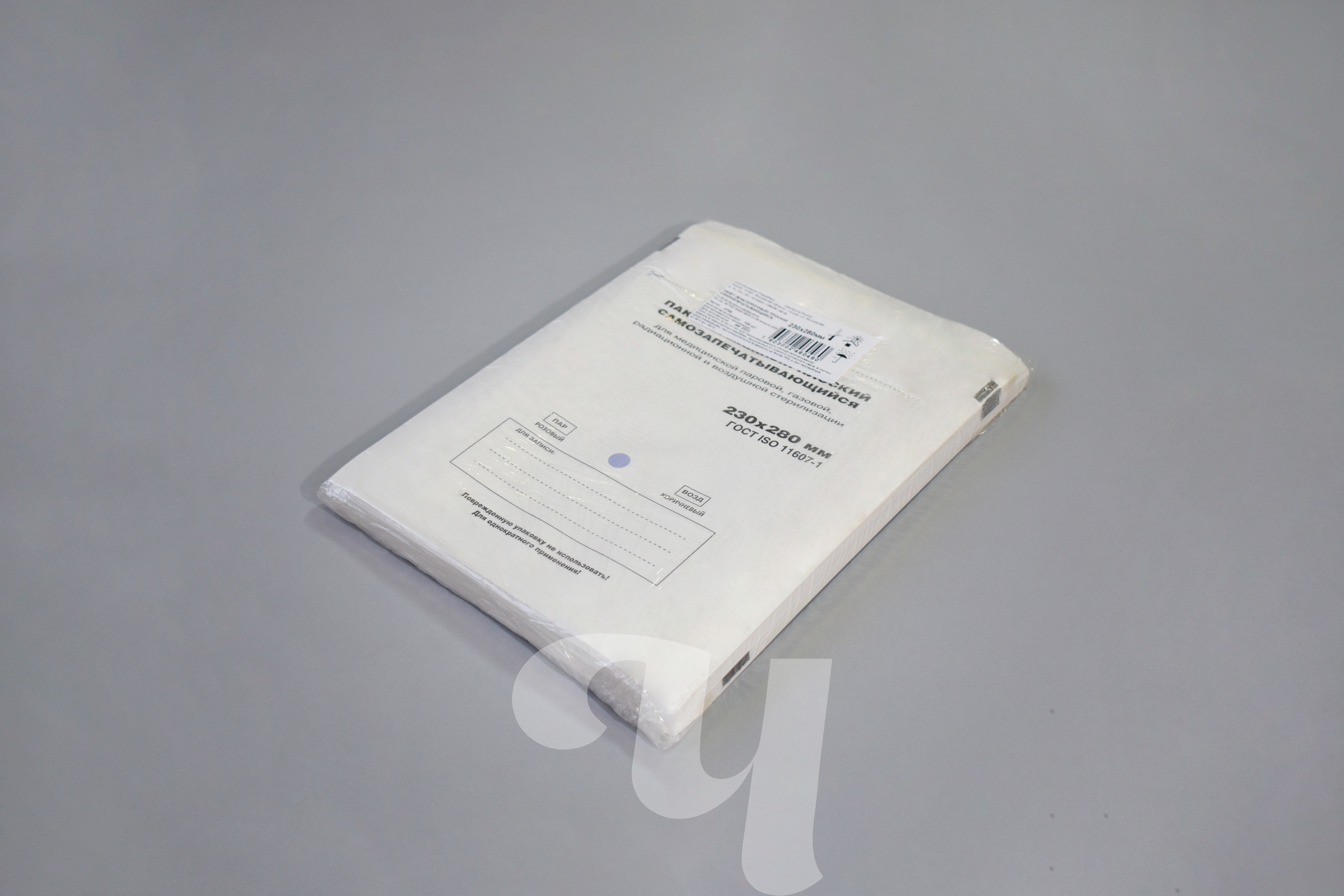 Пакет для стерилизации (влагопрочный, самозапечатывающийся) предназначен для упаковывания медицинских изделий перед стерилизацией. Предназначены для паровой, воздушной, газовой (оксидом этилена), радиационной  стерилизации. Срок годности: 7 лет. Оснащен индикатором 1 класса.