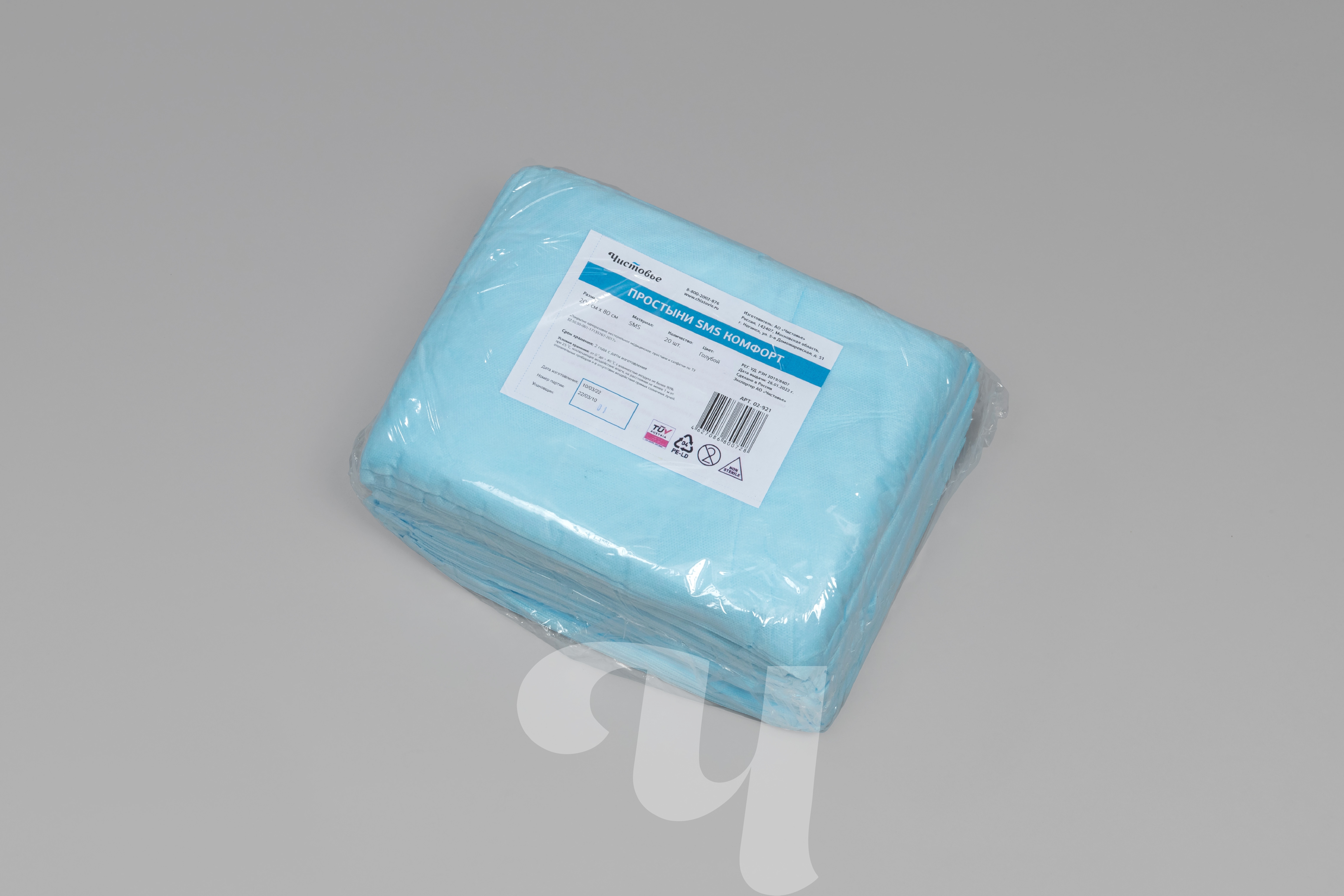 Простыни SMS медицинские (пелёнки) 17 г/м2 в штучной укладке, 200х80 см, Голубой, 20 шт/упк